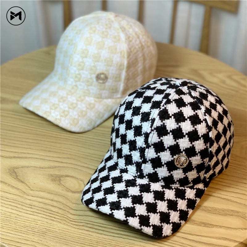 Topi Baseball Motif Kotak-Kotak Hitam Putih Aksen Berlian Imitasi Gaya Kasual Untuk Wanita